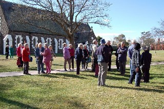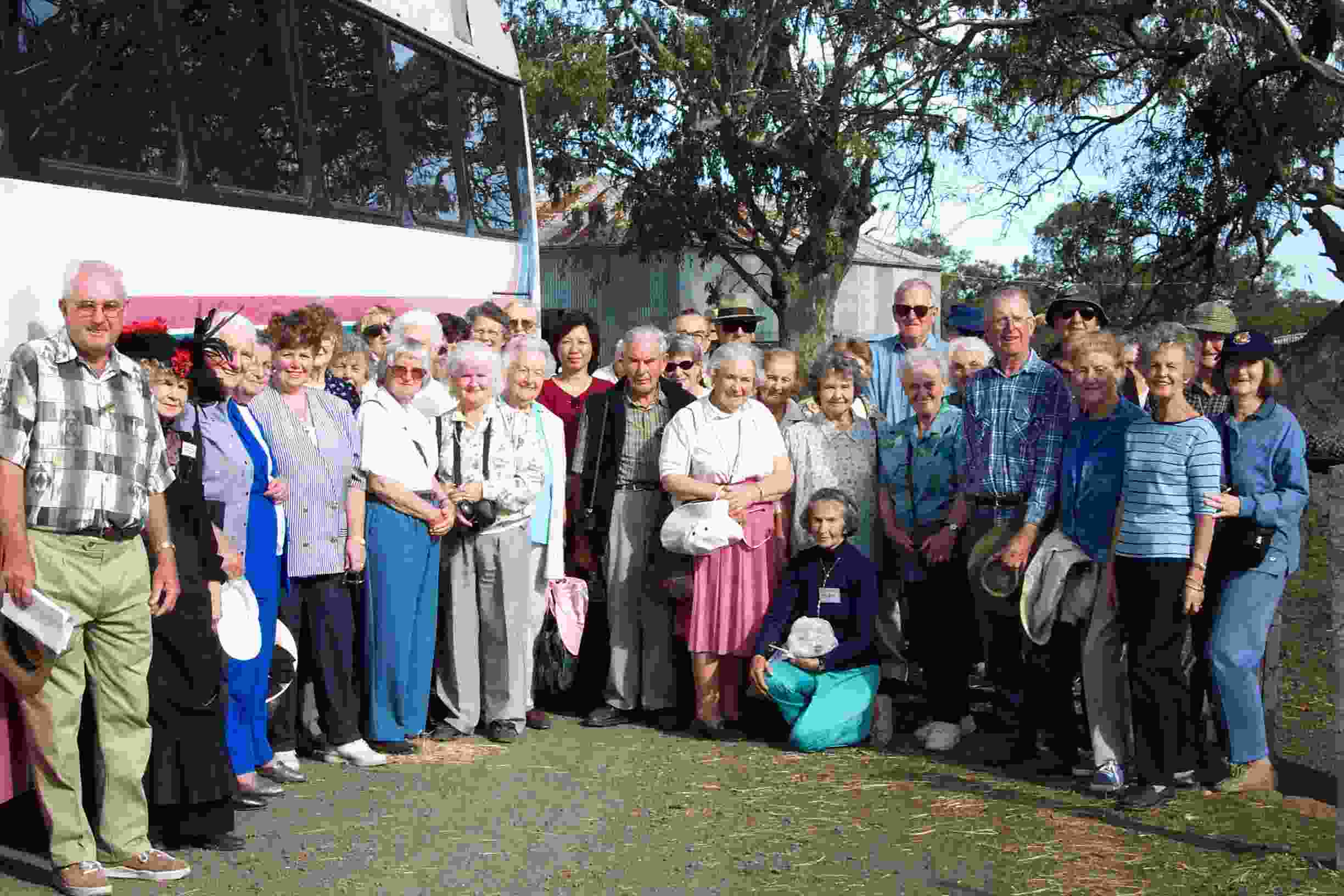 | On the road again WHS President Jim Tuhan (left) next to Whittlesea Historical Society’s Gwen Hawke, in period dress, with Waverley Historical Society members and friends on a day-trip to Whittlesea on 6 April 2003. |